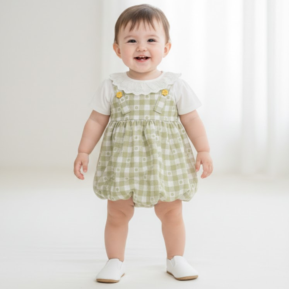The charming green checkered pattern combined with a detailed lace neckline creates a sweet and classic appearance. The floral accents and gathered skirt enhance the dress’s overall appeal, making it a standout outfit for your baby girl.