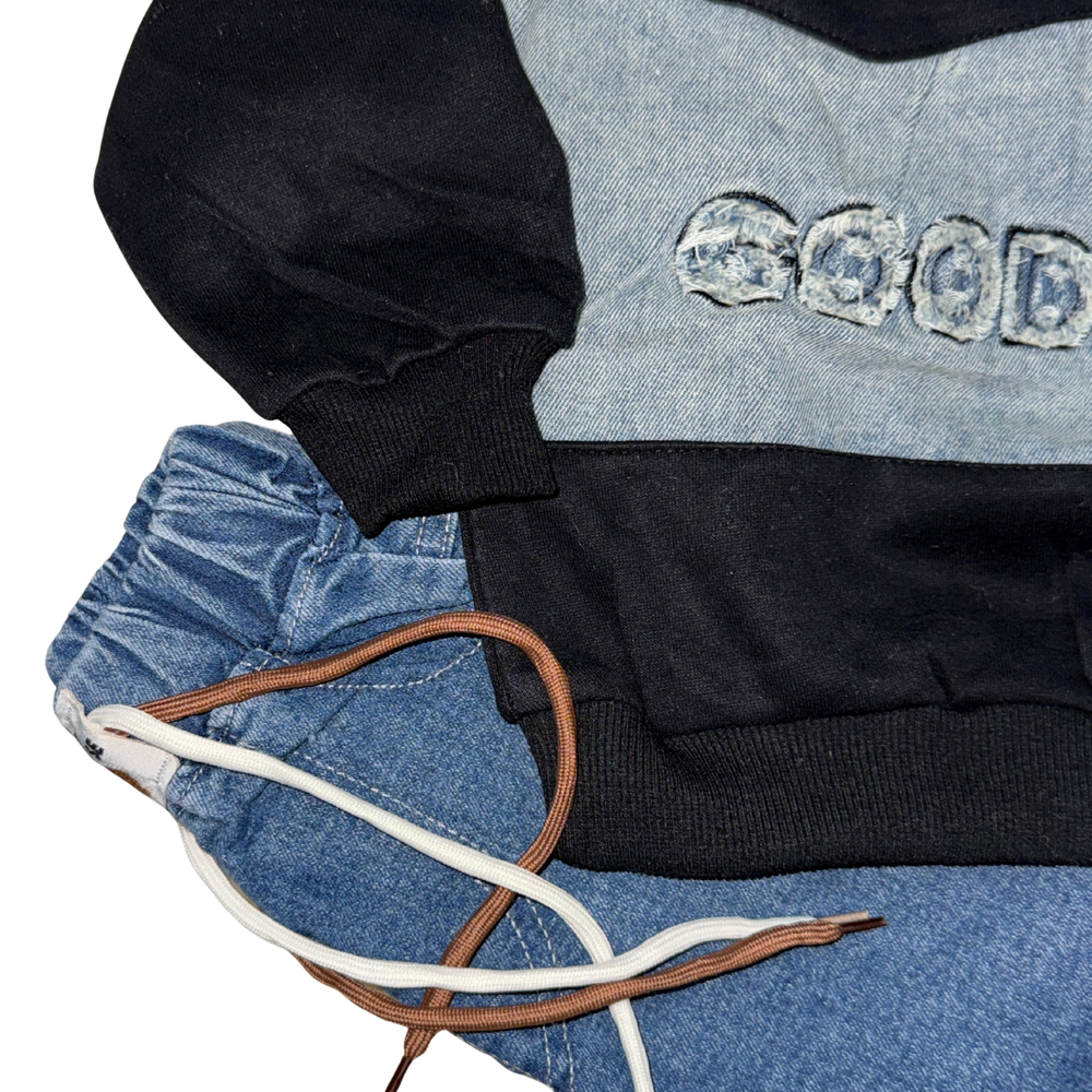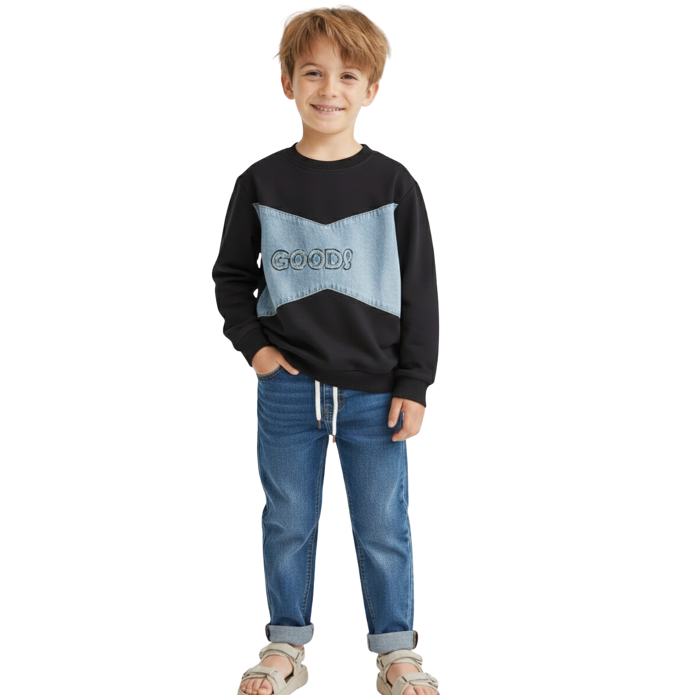 Dress your little boy in comfort and style with this trendy denim and cotton outfit set. The black sweatshirt features a soft cotton blend with a denim front panel and a pocket detail that adds a modern touch. The front design reads “GOOD!” in a stylish denim-textured font, making it both fun and fashionable for casual wear.