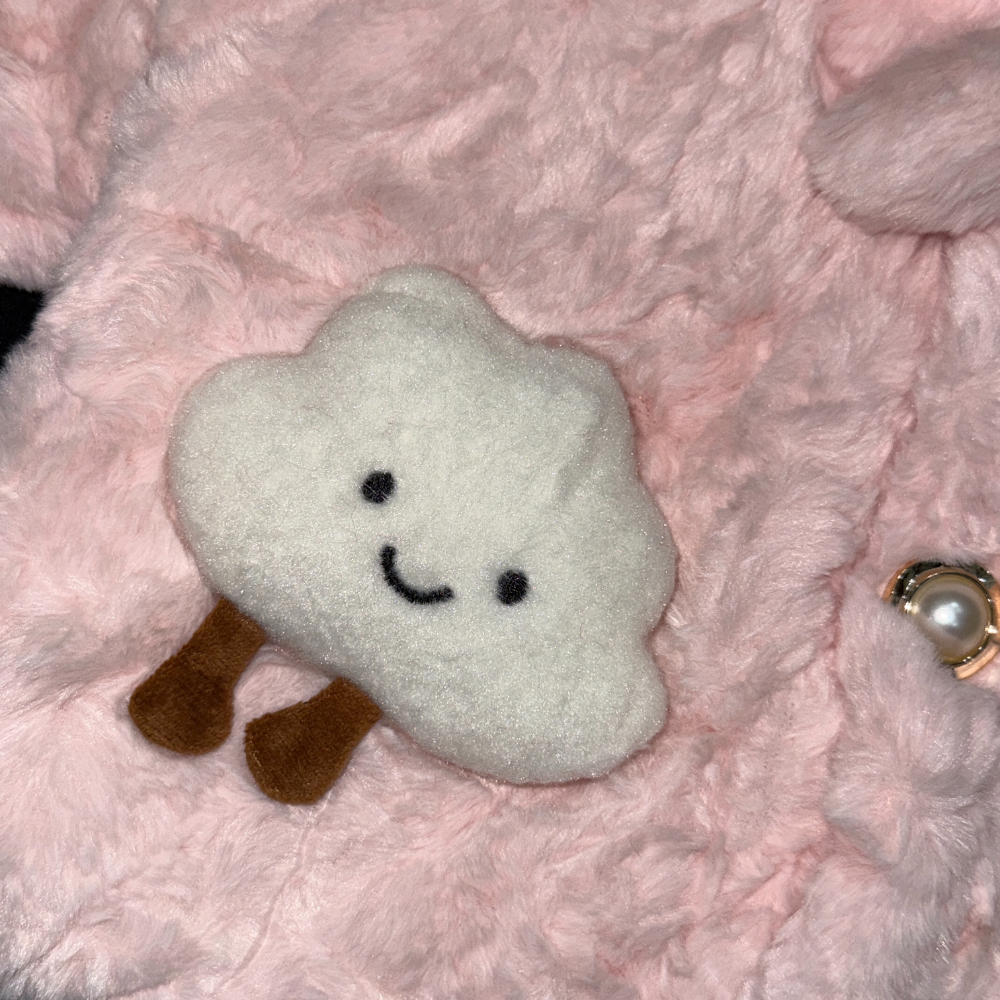 This soft fur jacket keeps kids warm and cozy with its plush texture and cute design. It features a hood lined with gentle fabric for added comfort and a front button closure for easy wear. The jacket includes adorable cloud shaped pocket patches that bring a fun and playful touch to the outfit.