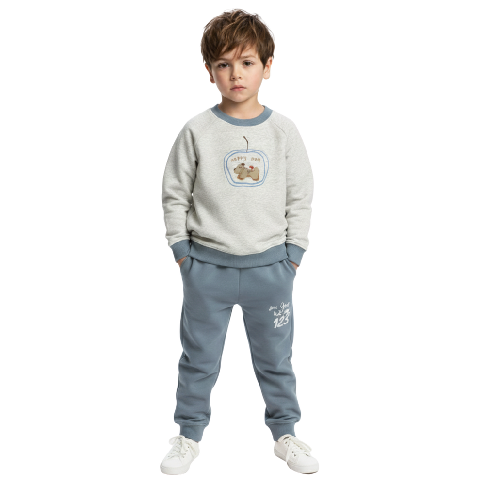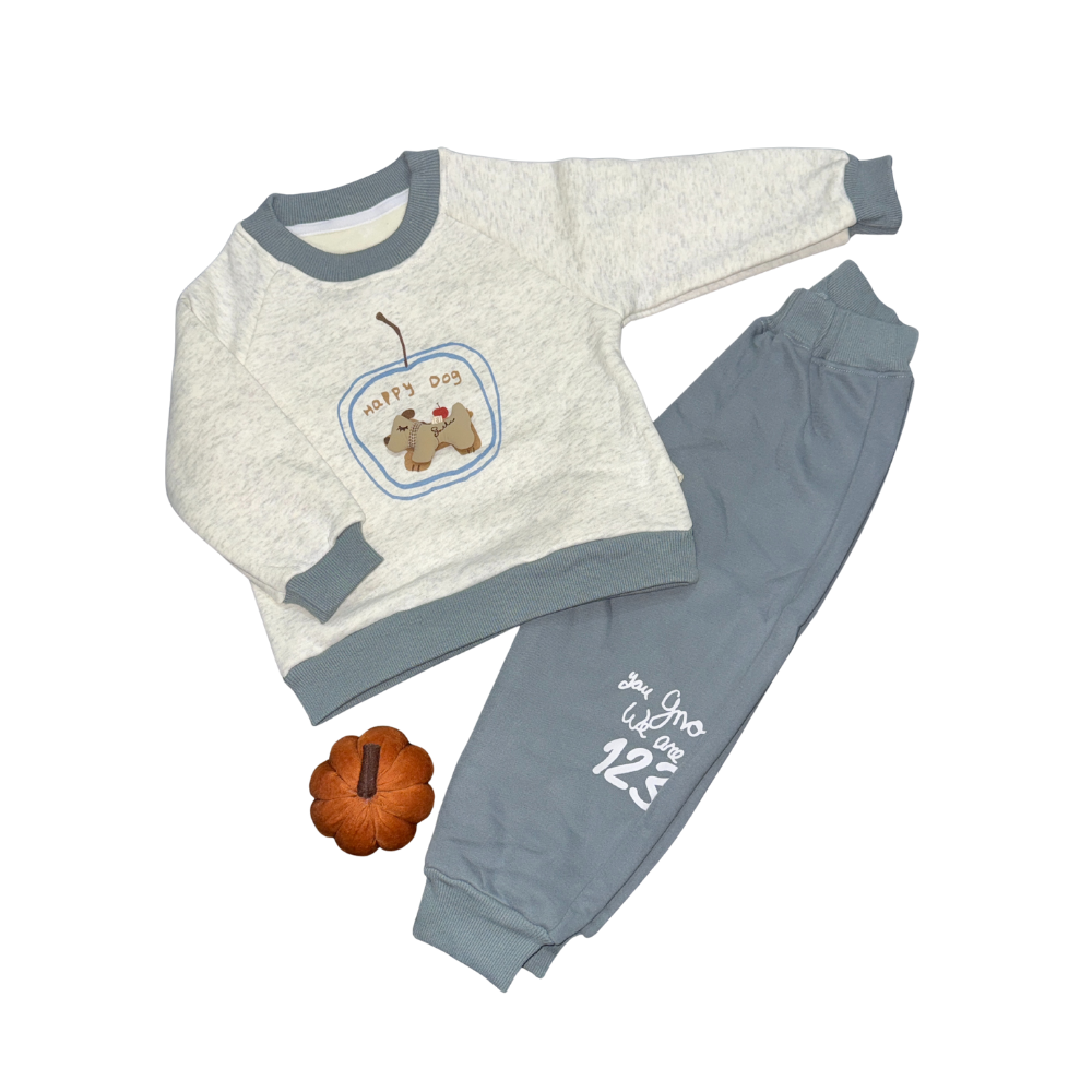 This comfortable kids outfit features a soft sweatshirt with a cute Happy Dog print paired with matching jogger pants. The sweatshirt has ribbed cuffs, collar, and hem that give it a cozy fit. The joggers come with a flexible waistband and ribbed ankle cuffs for easy movement and an all day comfort feel.